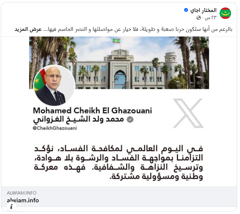 سررت كجميع المواطنين بتغريدة فخامة رئيس الجمهورية محمد بن الشيخ الغزواني أمس التي أكد فيها التزامه بمواجهة لا هوادة فيها للفساد والرشوة...