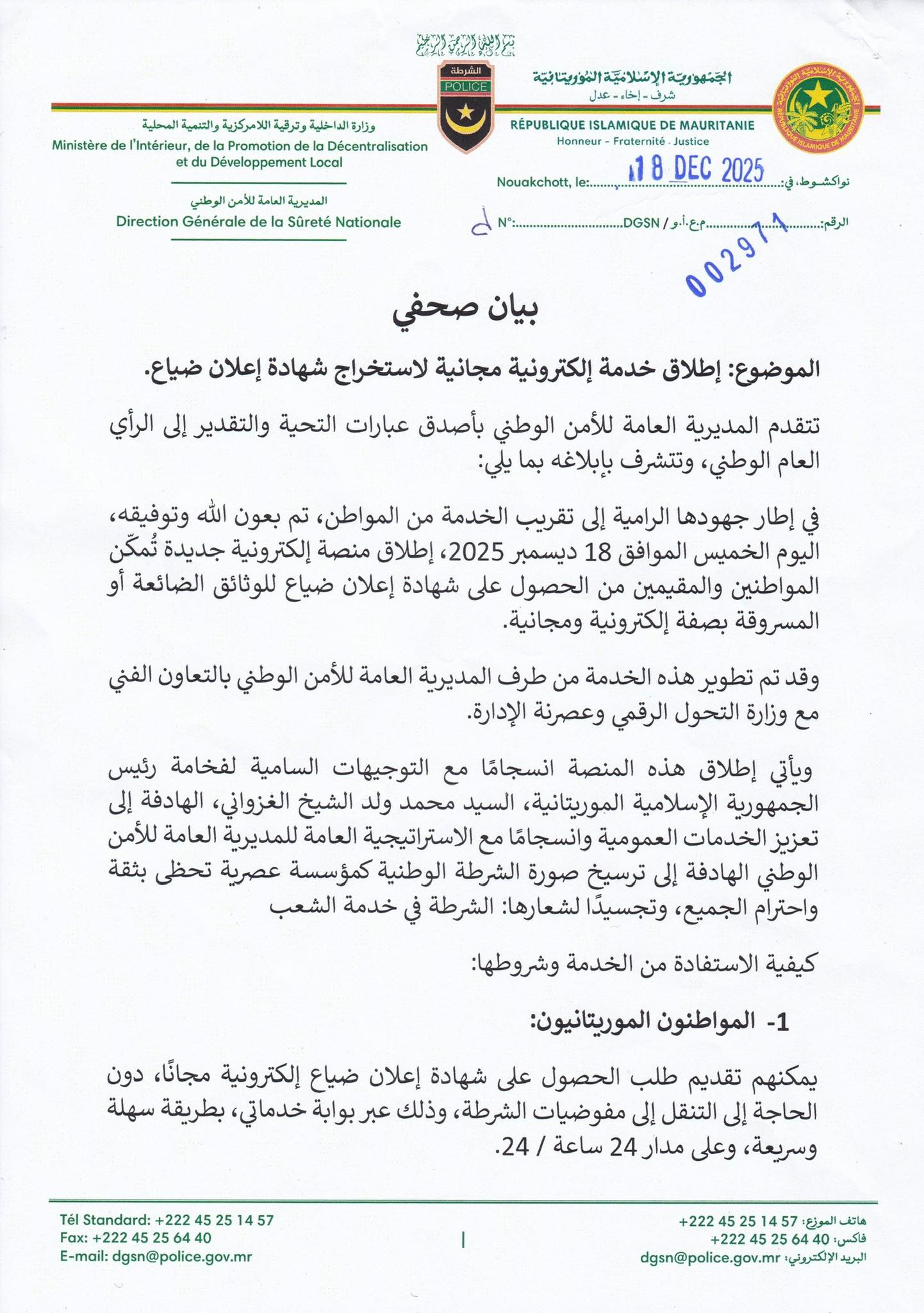 وتهدف المنصة الجديدة إلى تسهيل حصول الموريتانيين على مختلف الخدمات التي تقدمها المديرية العامة للأمن، من خلال إتاحة طلب مختلف الوثائق الإدارية التي تقدمها المديرية، مثل شهادة السوابق العدلية، بطريقة إلكترونية وسريعة وتقديم شكاياتهم وإبلاغاتهم عبر المنصة الإلكترونية، مما يسرع من عملية التعامل معها.