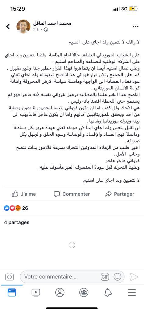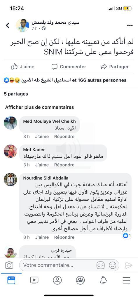 جاءت تدوينات اغلب المدونين الموريتانيين الموالين والمعارضين للنظام في أسلوب النقد والحيرة والسخط على النظام والترحم على اسنيم بعد تعيين الوزير السابق ولد اجاي على إدارة اسنيم. وهذه نماذج من هذه التدوينات: