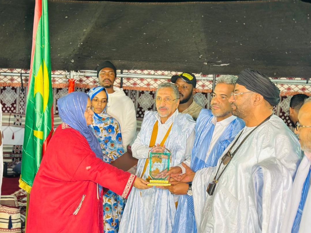 تسلم رئيس النقطة الصحية تكريمه من طرف حاكم مقاطعة المذرذرة محمد محمود ولد الفاظل وفضيلة الـخليفة العام للطريقة القادرية في غرب أفريقيا الشيخ عبد العزيز بن الشيخ آياه والشيخة العزة بنت الشيخ آياه.