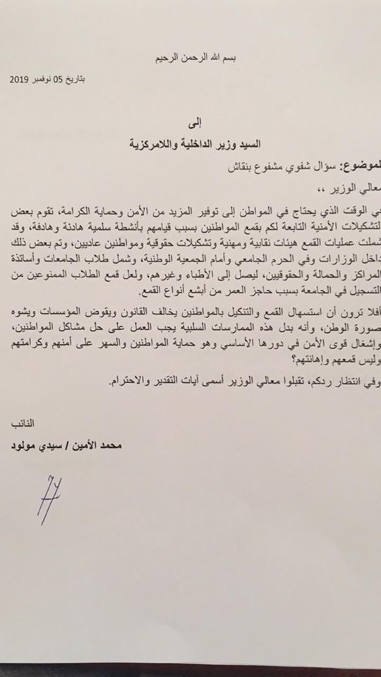 وقال النائب ولد سيدي مولود في تدوينة له إنه يرجو ان تبرمج الجمعية جلسة عاجلة لمساءلة وزير الداخلية حول القمع(انظر الصورة المرفقة)