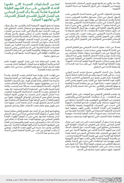 إستراتيجية التصدي لوباء الكوفيد- 19 ، اتخذ الاتحاد الأفريقي خطوات لتعزيز قدرات المركز التابع له للوقاية من الأمراض بوسائل منها إتاحة المساهمات المالية )CDC( والسيطرة عليها