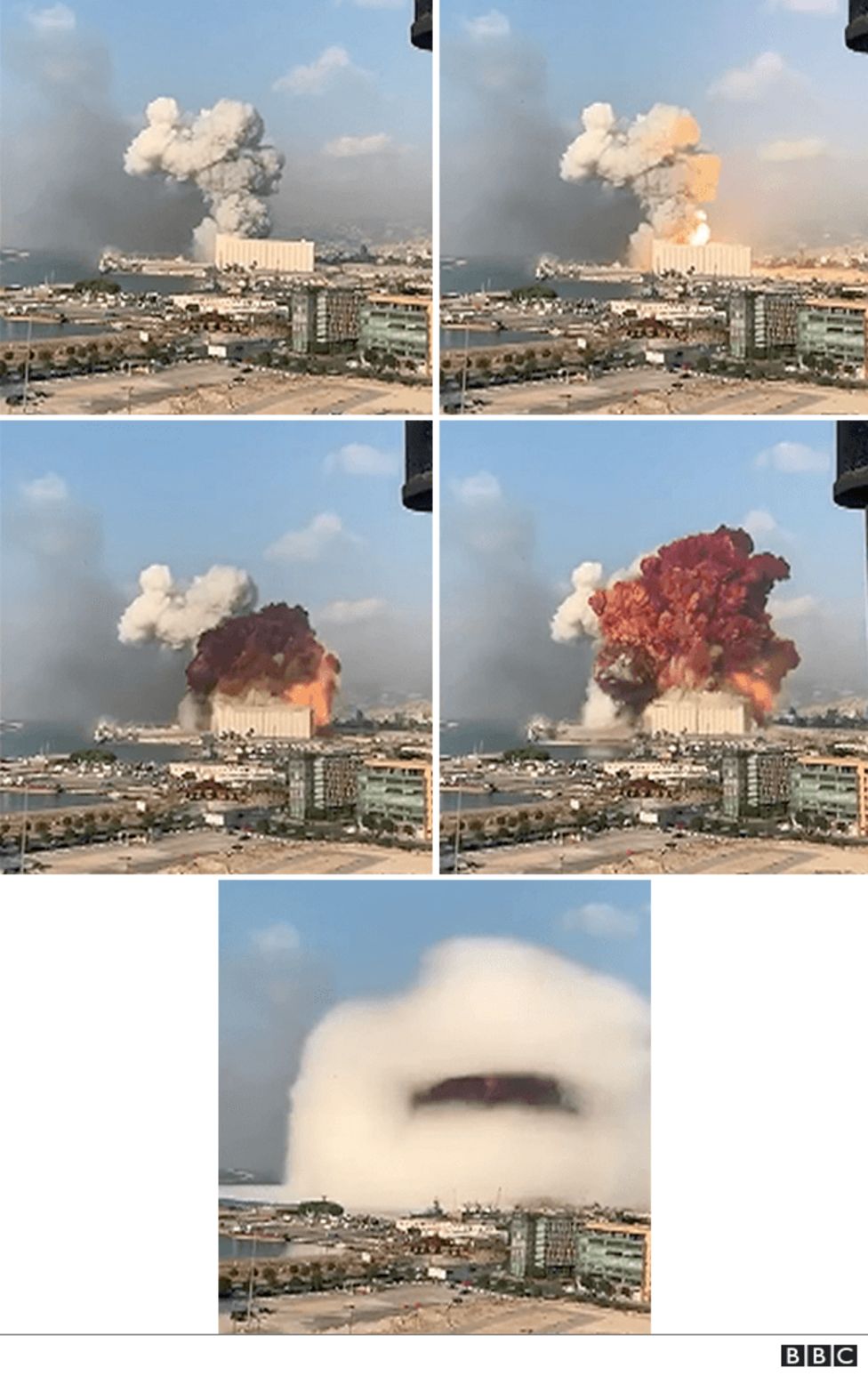 وبعد 35 ثانية من الإنفجار الأول، وقع إنفجار ثان هائل أدى إلى إرتفاع عمود كبير من الدخان بني اللون تبعه إرتفاع غمامة بيضاء اللون.