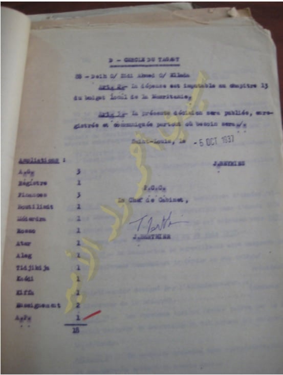 قرار صادر بتاريخ 5 أكتوبر 1937 عن الوالي العام الفرنسي بموريتانيا، ويقضي بإعطاء منحة مبلغها 60 فرنكا لمدة السنة الدراسية 1937-1938 للتلاميذ التالية أسمائهم: