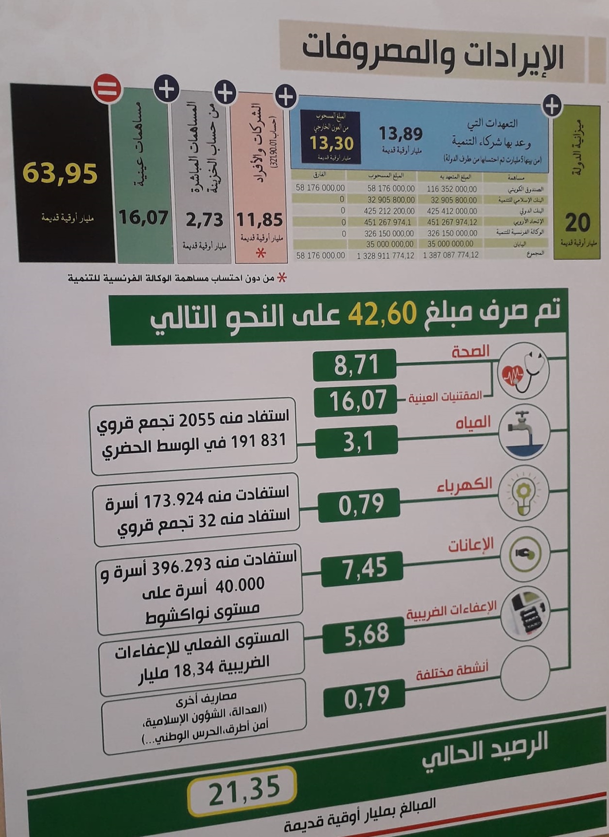 منذ تأسيس الصندوق حتى نهاية شهر ابريل الماضي تم صرف مبلغ 42.6 مليار أوقية قديمة من أصل 63.95 مليار أوقية قديمة هي حصيلة الصندوق منذ إنشائه.