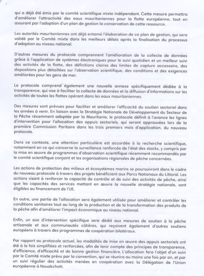 هذا الاتفاق الجديد، الذي يحل محل الاتفاق السابق الموقع منذ 2008، يقضي بمواصلة الشراكة بين الاتحاد الأوربي وموريتانيا في مجال الصيد ويأخذ في الحسبان الاستراتيجية الموريتانية الجديدة التي اعتُمدت مؤخرا حول تحديث مختلف القطاعات الاقتصادية الوطنية.