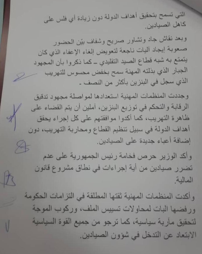 وجاء في بيانهم "بعد نقاش جاد وتشاور صريح وشفاف بين الحضور صعوبة ايجاد آليات ناجعة لتعويض إلغاء الإعفاء الذي كان يتمتع به شبه قطاع الصيد التقليدي".
