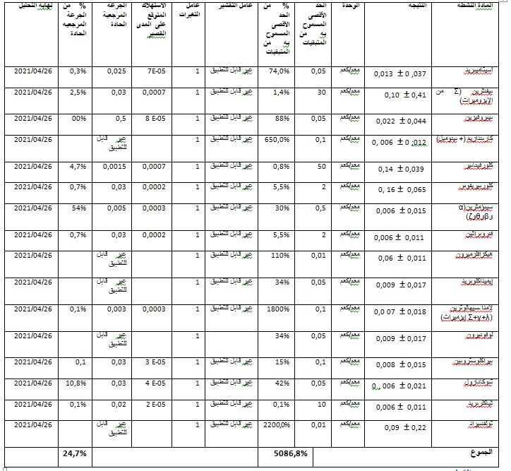 – كتبت باللون الأحمر المبيدات التي يتجاوز تركيزها الحد الأقصى المسموح به من المتبقيات. وهكذا، فإن نسبة الحد الأقصى المسموح به من المتبقيات تفوق 100 %. إن تركزات هذه الجزيئات المكتوبة بالأحمر هي ما يجعل المنتجات غير مطابقة.
