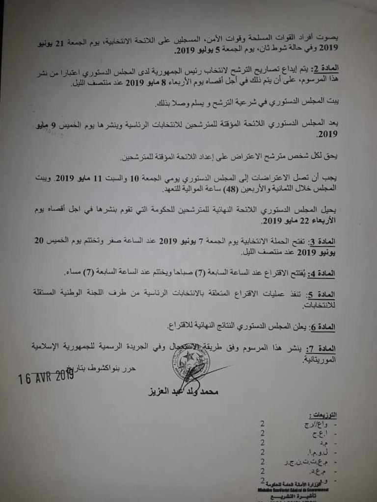 أعلنت الرئاسة الموريتانية اليوم الثلاثاء، بموجب مرسوم صادر عنها موعد الانتخابات الرئاسية وموعد تصويت القوات المسحلة، وكذلك موعد انطلاق الحملة الانتخابية، وموعد صدور اللائحة النهائية للمترشحين للرئاسيات من طرف المجلس الدستوري: