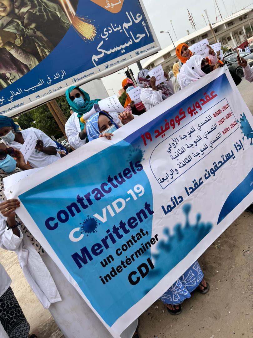 نظم المكتب التنفيذي للاتحاد العام لعقدويي وزارة الصحة صباح اليوم الاثنين وقفة احتجاجية أمام وزارة الصحة بنواكشوط طالب خلالها بعقد دائم لعقدويي كوفيد - 19.