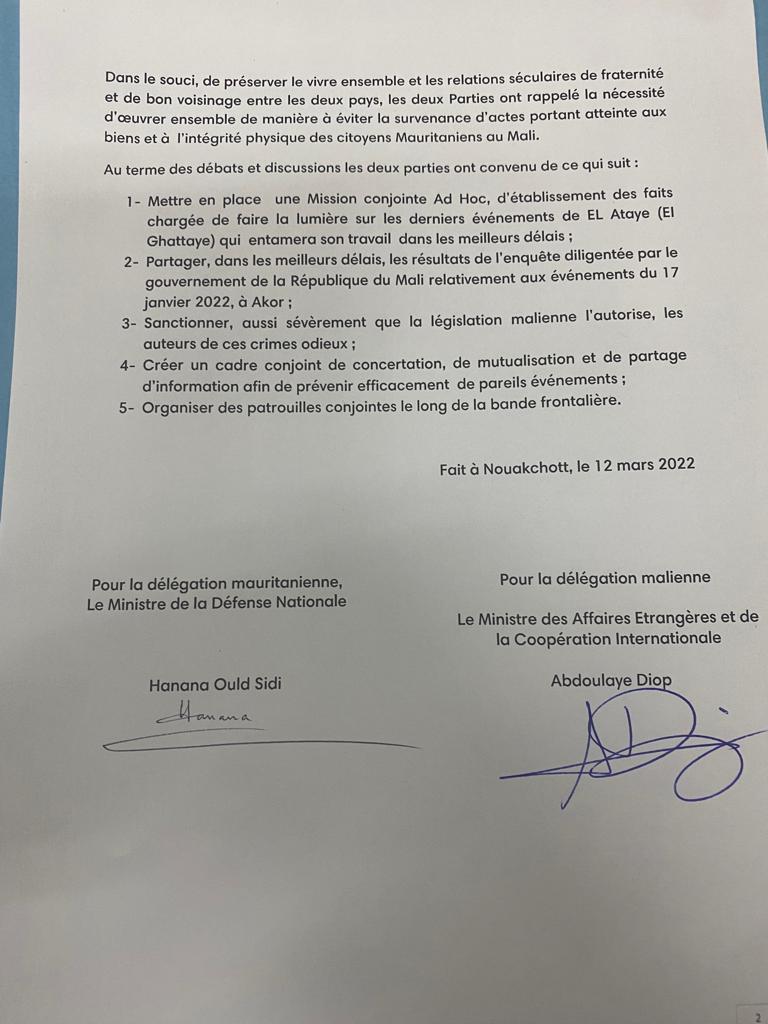 2- إبلاغ الجانب الموريتاني في أقرب الآجال بنتائج التحقيق الذي بدأته الحكومة المالية بخصوص أحداث 17 يناير 2022 في اقور؛
