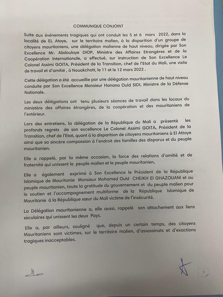 " إثر الأحداث المأساوية التي أدت، في 5 و6 من مارس 2022، في بلدة العطاي في الأراضي المالية، إلى اختفاء مجموعة من المواطنين الموريتانيين، قام وفد مالي رفيع المستوى يقوده معالي السيد عبد الله جوب، وزير الشؤون الخارجية والتعاون الدولي، وبأمر من صاحب الفخامة العقيد اسيمي غويتا، رئيس السلطة الانتقالية رئيس دولة مالي، بزيارة عمل وصداقة للعاصمة نواكشوط يومي 11 و12 مارس 2022.