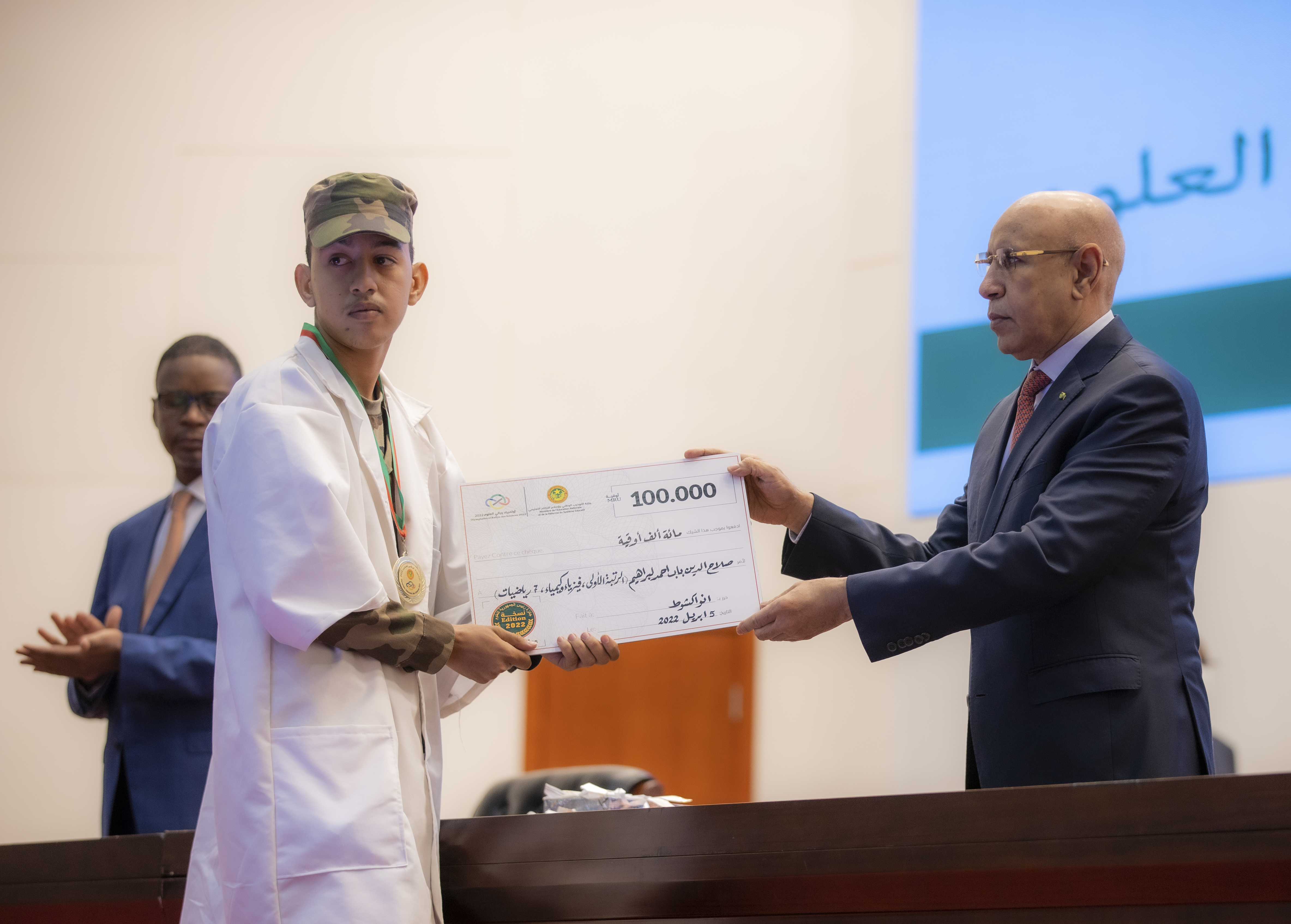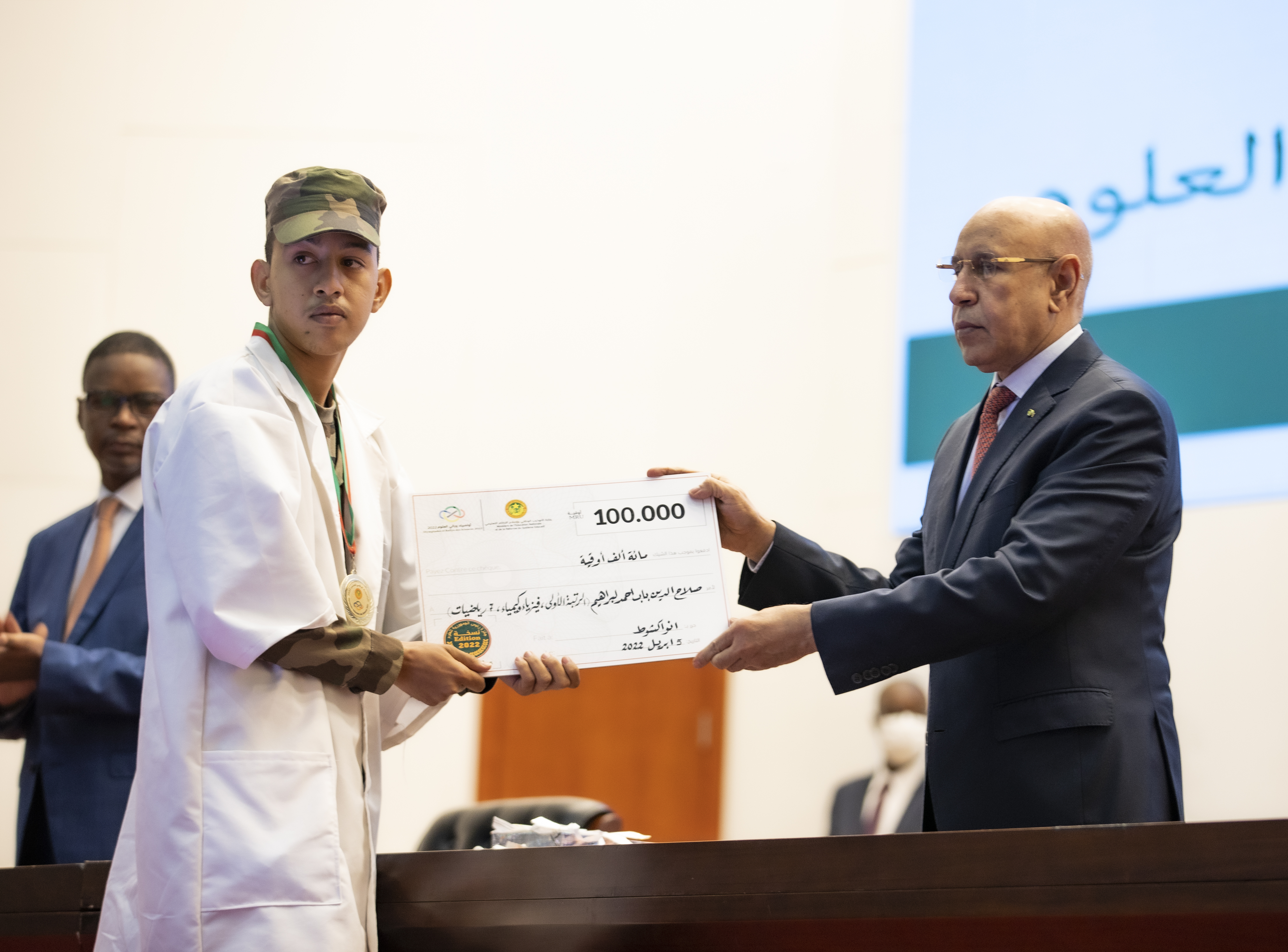وسلم رئيس الجمهورية الجائزة الأولى للسنة الثالثة من إعدادية امتياز نواذيبو وتسلمها نيابة عن الفريق التلميذ محمد سالم صمب، والجائزة الأولى الخاصة بالخوامس الثانوية لفريق نواكشوط الجنوبية، تسلمها نيابة عن الفريق التلميذ محمد الحسن زيدان، والجائزة الأولى للسنوات السوادس لفريق انواكشوط الشمالية وتسلمها نيابة عنهم التلميذ شيخنا لمرابط بيده.