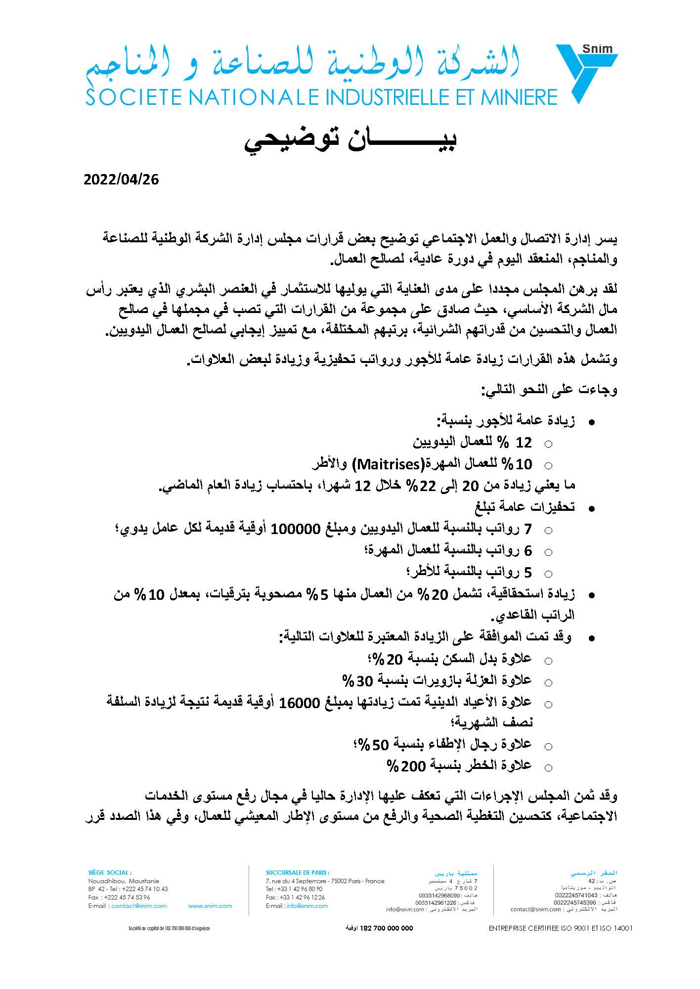 أعلنت الشركة الوطنية للصناعة والمناجم سنيم في بيان نشرته اليوم الثلاثاء أنها قررت زيادة في الأجور والتحفيزات لعمالها.
