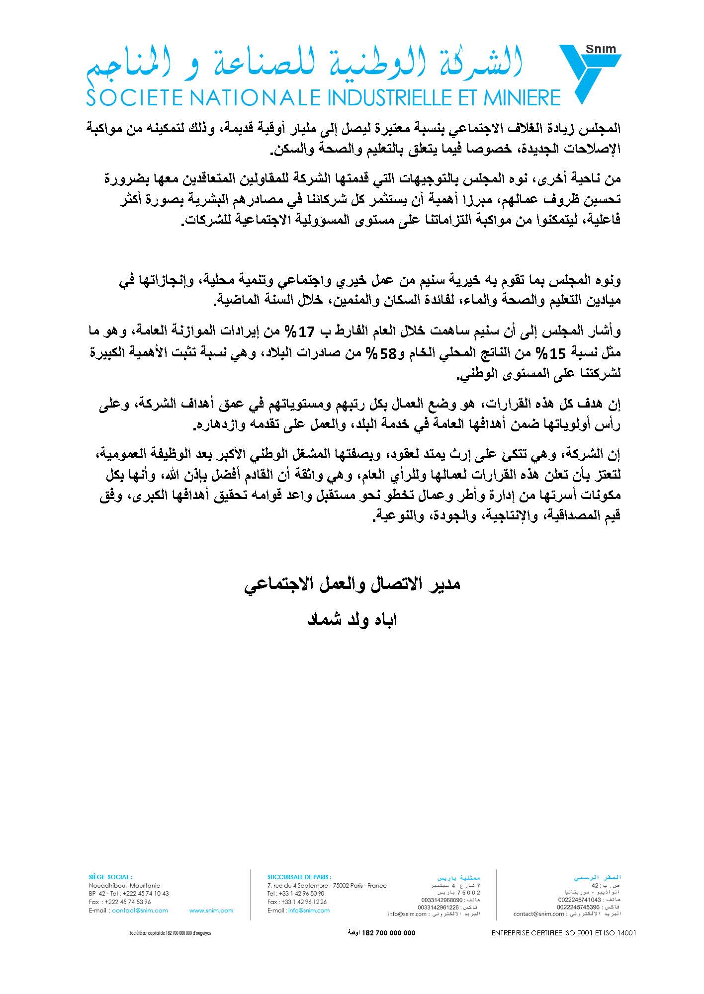 وقد ثمن المجلس الإجراءات التي تعكف عليها الإدارة حاليا في مجال رفع مستوى الخدمات الاجتماعية، كتحسين التغطية الصحية والرفع من مستوى الإطار المعيشي للعمال، وفي هذا الصدد قرر المجلس زيادة الغلاف الاجتماعي بنسبة معتبرة ليصل إلى مليار أوقية قديمة، وذلك لتمكينه من مواكبة الإصلاحات الجديدة، خصوصا فيما يتعلق بالتعليم والصحة والسكن.